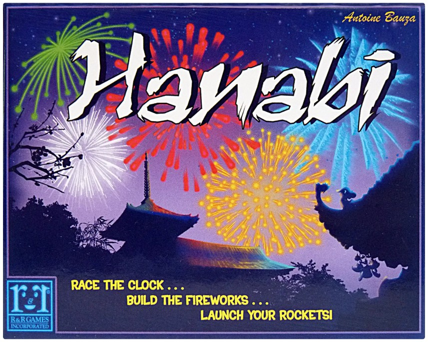 Hanabi—named for the Japanese word for "fireworks"—is a cooperative game in which players try to create the perfect fireworks show by placing the cards on the table in the right order. (In Japanese, hanabi is written as 花火; these are the ideograms flower and fire, respectively.)