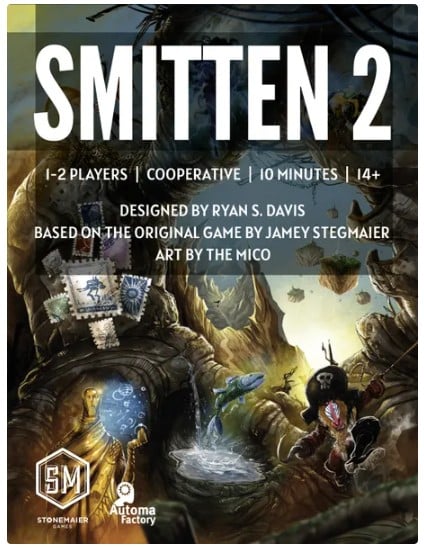Smitten 2 is a cooperative micro-game for 1-2 players. The 9 new cards in this standalone sequel are designed by Ryan S. Davis. In Smitten 2, players work cooperatively with limited information/communication to complete two identical 3×3 grids of cards, each inspired by Stonemaier games released since the original Smitten and illustrated by The Mico. There are multiple difficulty levels and separate modes for solo and 2-player games.