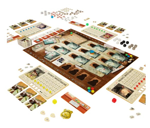 On your turn, draft a die from the pool and choose your action. Improve your skills with Office, talk to suspects with Calendar, investigate the city for evidence, use Flimflam to distract the cat or gain extra clues, dive into new cases, stock up on bullets, or just sit back and read the newspaper for additional hints.
