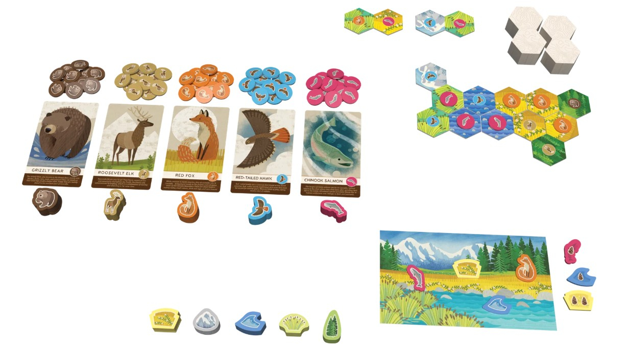 In Cascadia Junior, players take turns drafting habitat tiles and adding them to their environment. They must try to match the same habitats to grow their habitat corridors and score more points while creating groups of three wildlife icons on connected tiles. Once they make matches, they earn wildlife and habitat sighting tokens that they can add to their panorama board, where they will make their own personal picture of the Cascadian wilderness! At the end of the game, all players flip over their sighting tokens to discover the conifer cones they have collected. The player with the most cones wins!