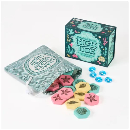 High Tide is a strategic stacking game for two players inspired by mutualistic relationships found in the natural world. The game is played without a board on any flat surface with 19 wooden hexagon tiles: 7 tiles for each player and 5 neutral tiles. The tiles are randomized in a grid at the start of each round, leading to over six million different starting positions — and millions more unique and pretty end states!