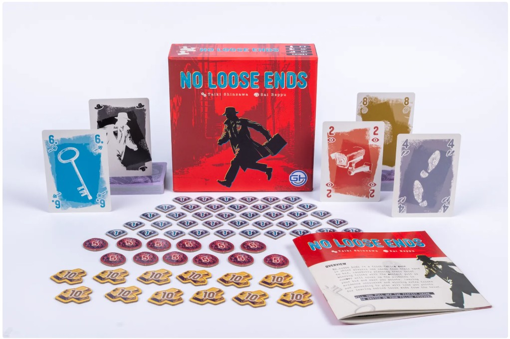 No Loose Ends is a trick-taking game in which players use cards from their hand to bid, carefully planning their heist. Winning tricks with the right suit or number will cover up the evidence in your bid and earn you points. Uncovered evidence and extra tricks not according to plan will lose you points for leaving loose ends from the robbery.