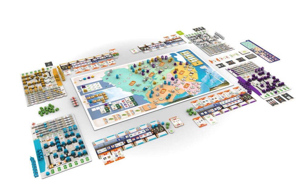 Pampero is a hand-management, card-driven action-selection game. Every player has a starting set of eight cards to be played on their own tableau, which contains two rows of spaces to activate actions on the different sectors of the board. Each turn, you have the option to play a card to the leftmost empty space of either row or to retrieve all cards from your tableau. After three actions, a special phase takes place — consolidation, during which you retrieve the rightmost card from any row, generate batteries from stored energy, collect income, and advance the game timer. The player with the most money at the end of the game wins.