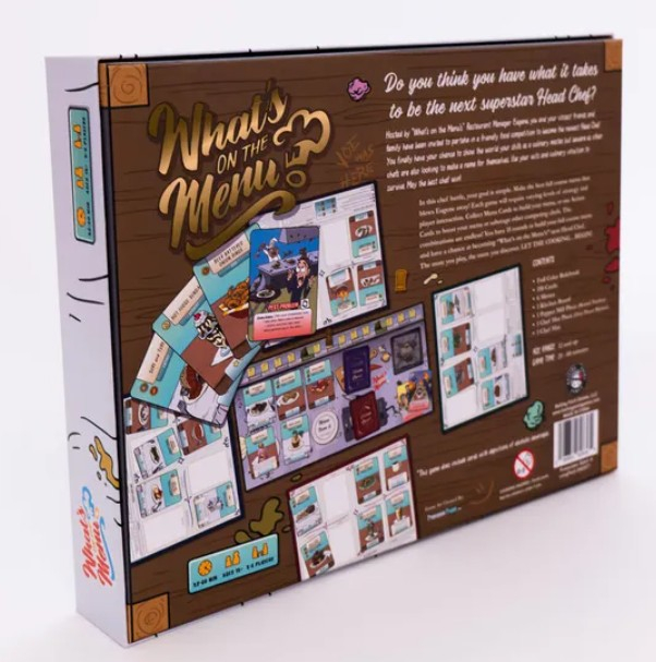 In this chef battle, your goal is simple, make the best full course menu that blows our restaurant manager, Eugene, away! Each game will require varying levels of strategy and player interaction. Collect Menu Cards to build your menu, or use Action Cards to either boost your menu or sabotage other competing chefs. The combinations are endless! You have 15 rounds to build your full course menu and have a chance at becoming "What's on the Menu's" next head chef!