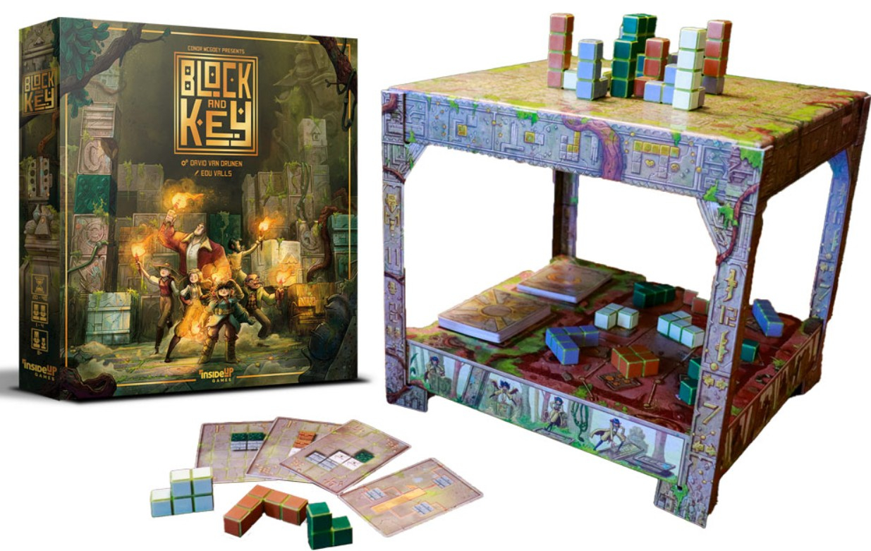 In Block and Key, adventurers place 3D clay blocks in a centralized raised playing area, with the goal of completing their own request cards. The challenge is made more interesting as each player is limited to their "2D" viewpoint.
