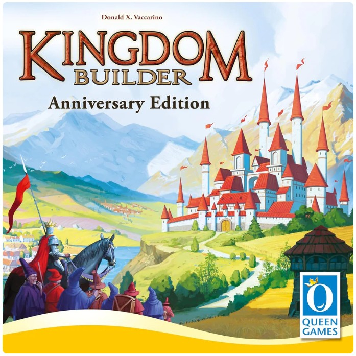 10th anniversary edition of Kingdom Builder featuring 28 printed resin ability tiles, 212 plastic miniatures, 8 game board sections with new art, 30 extra large terrain cards with new art, and 4 Queenies including The Emperor's Choice.