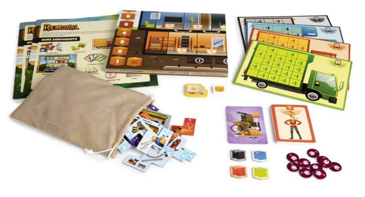 Each player takes on the role of a Removal company’s workers, trying to fill their car with all sorts of junk without breaking anything. Players gradually rummage through the house in an attempt to transport the most valuable objects and not drive around with empty car. Some objects cannot lie on their sides, others can be broken if you transport them not carefully, and some are so heavy that they cannot be carried anywhere but on the bottom.