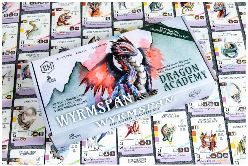 As a budding dracologist, you open an academy for fledgling dragons to achieve their full potential! The expansion to Wyrmspan adds a wide variety of new dragons and caves, objective tiles, dragon guilds, and a new round tracker that presents you with an income choice when you pass for the round. Welcome to Wyrmspan: Dragon Academy, designed by Connie Vogelmann and illustrated by Clémentine Campardou!